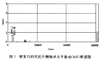 根據(jù)上述分析,及時停機(jī)檢查,結(jié)果發(fā)現(xiàn):電機(jī)風(fēng)扇的6個扇葉掉了1個,造成了不平衡。風(fēng)扇修復(fù)后測得振動頻譜圖如圖7,振動有效值見表2。各點(diǎn)振動均恢復(fù)正常。如故障時最大的風(fēng)機(jī)外側(cè)軸承水平振動8H由7.6mm/s降為2.3mm/s。
