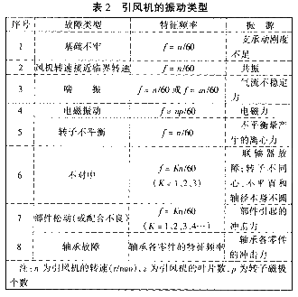 從振動(dòng)診斷的角度來看,①引風(fēng)機(jī)是一種旋轉(zhuǎn)機(jī)械因而有不平衡、不對(duì)中之類的故障,②引風(fēng)機(jī)是一種流體機(jī)械,有旋轉(zhuǎn)失速、喘振的可能性存在,③引風(fēng)機(jī)受工作環(huán)境的影響,經(jīng)常造成葉片的磨損,介質(zhì)還可能粘附在轉(zhuǎn)子上形成隨機(jī)性變化的不平衡,④引風(fēng)機(jī)由電機(jī)驅(qū)動(dòng),可能存在電磁振動(dòng)。為此,引風(fēng)機(jī)的振動(dòng)可歸結(jié)為8種類型,見表2。