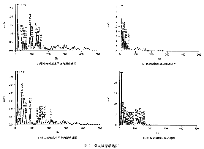 該引風(fēng)機(jī)不平衡振動(dòng)最明顯的特征,一是徑向振動(dòng)大,二是諧波能量集中于基頻(12.33Hz),而該引風(fēng)機(jī)的徑向振動(dòng)均在30μm以下;在圖2所示的徑向頻譜中,基頻振動(dòng)最大只有3.35mm/s。因此,引風(fēng)機(jī)的振動(dòng)并非由不平衡引起。