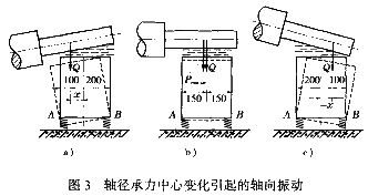 所謂軸承扭振是軸在旋轉(zhuǎn)狀態(tài)下,軸承對(duì)軸的承力中心點(diǎn)將隨轉(zhuǎn)速周期性地沿軸向變化。圖3a表示轉(zhuǎn)子在某一位置時(shí),軸承承力中心點(diǎn)偏于A側(cè);圖3c表示轉(zhuǎn)子轉(zhuǎn)過180°后,軸承承力中心點(diǎn)偏于B側(cè)。若軸承座和基礎(chǔ)沒有彈性,則軸承承力中心點(diǎn)的變化始終在軸承座底邊AB范圍內(nèi),它不會(huì)引起軸承座的軸向振動(dòng)。實(shí)際上,軸承座和基礎(chǔ)組成的支承系統(tǒng)具有一定的彈性,在軸承承力中心點(diǎn)周期性變化的作用下,軸承座將沿某一底邊發(fā)生周期性的軸向振動(dòng),且振值忽大忽小,極不穩(wěn)定。即使軸承座固定螺栓很緊,這種現(xiàn)象也難以避免。